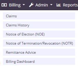 To begin automatic claim validation, navigate to the Billing tab and select Claims, Notice of Election (NOE) or Notice of Termination/Revocation (NOTR) based on the type of claims being verified and submitted.