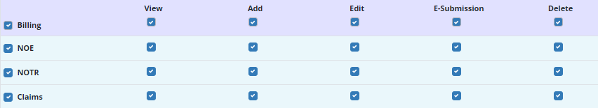 People tab ➜ People Center ➜ Edit ➜ Permissions tab ➜ Billing section ➜ NOE/NOTR/Claims ➜ View/Add/Edit/E-Submission/Delete ➜ Save