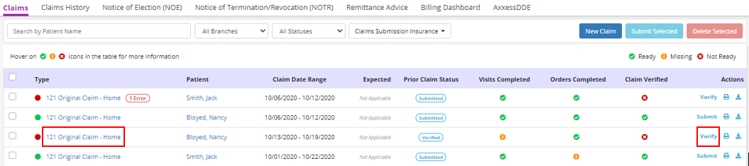 Once all errors have been resolved, the claim will be verified and ready to submit. To submit a claim, click Submit under Actions or select multiple verified claims and click Submit Selected to submit in bulk.