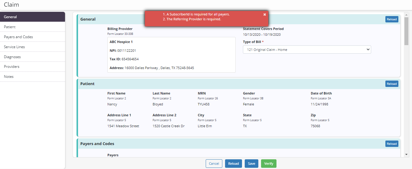 When Verify is selected, the system will check that all required information has been added to the claim. If any information is missing, the user will be prompted to add the missing information.