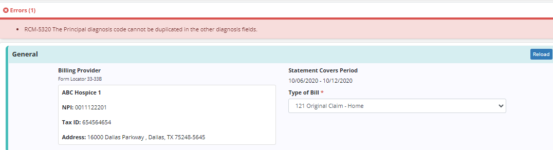 Once all the required fields have been entered, the software will automatically run Axxess RCM clearinghouse validations. Any errors that are found will appear at the top of the screen to be corrected before submitting the claim.