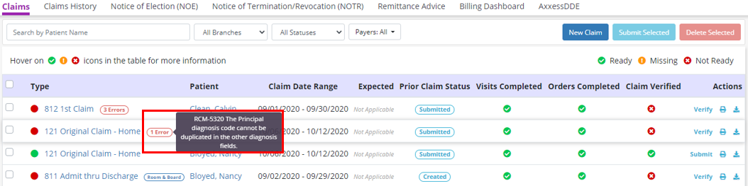 In the list of claims, claims with errors will have a badge identifying the number of errors in the claim. To view the errors, hover over or click the error badge.