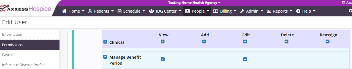 People tab ➜ People Center ➜ Edit ➜ Permissions tab ➜ Clinical section ➜ Manage Benefit Period ➜ View/Edit ➜ Save