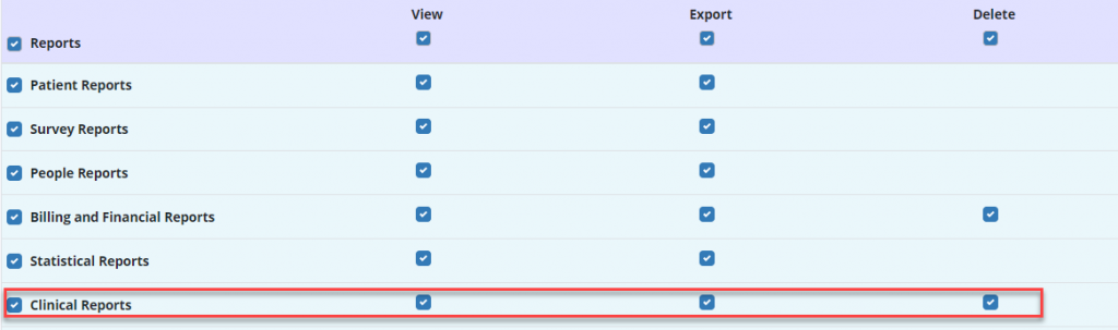 People tab ➜ People Center ➜ Edit ➜ Permissions tab ➜ Reports section ➜ Clinical Reports ➜ View/Export/Delete ➜ Save