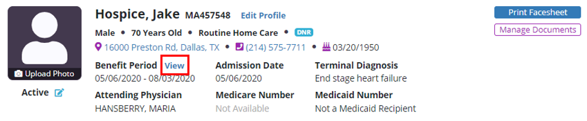 Patients tab ➜ Patient Charts ➜ Benefit Period ➜ View