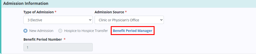 The Benefit Period Manager displays admission information for the patient and corresponding benefit period details for each of the patient’s admissions to the agency.