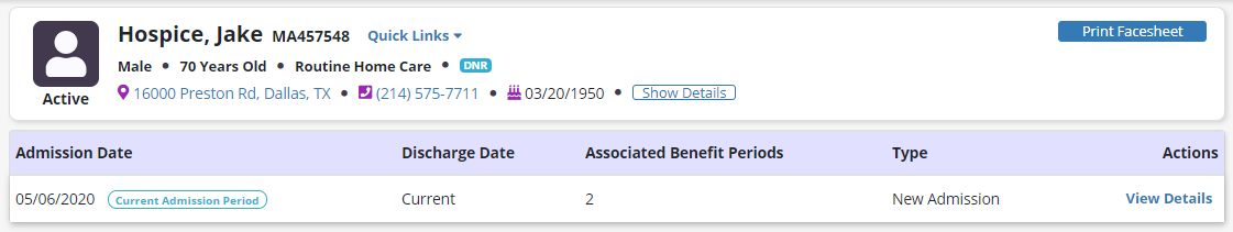 Click View Details under Actions to view benefit period details for the selected admission. Details will expand to display the benefit period number, start date and end date for each benefit in the admission.