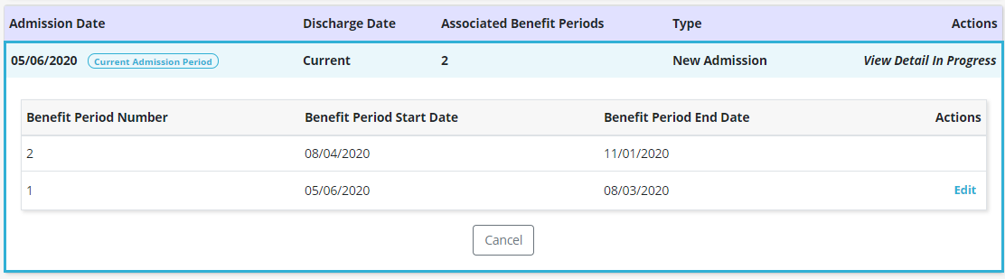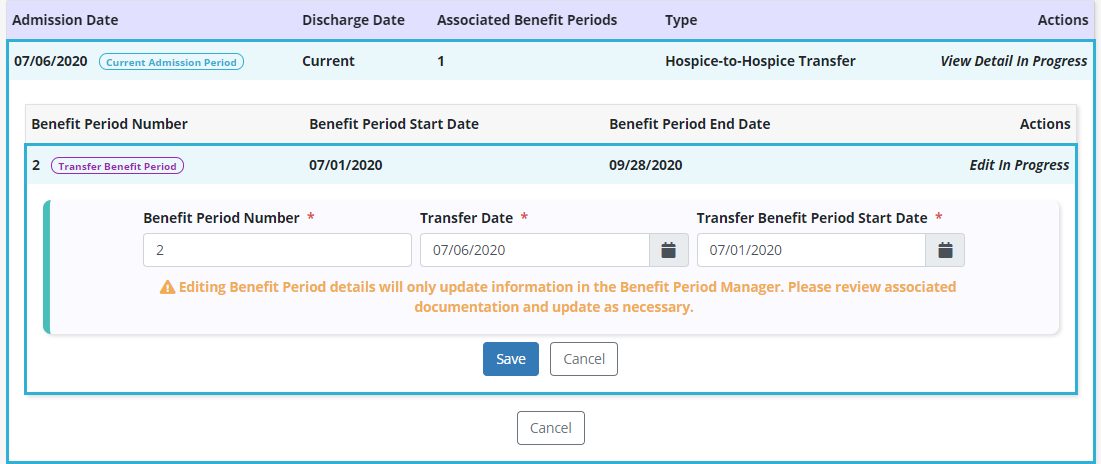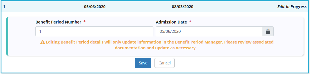 For new admissions, users can update the initial benefit period number and admission date for the patient. The patient’s benefit period start and end dates will automatically update based on these changes. Click Save to confirm your changes or Cancel to keep the original data.