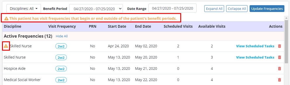 If an existing visit frequency begins or ends outside of the updated benefit period date range, users will see a warning message at the top of the frequency screen for that patient. The frequencies that fall outside of the updated benefit period will also be labeled with a yellow warning symbol (⚠).