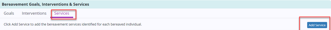 Bereavement Goals, Interventions & Services section ➜ Services tab ➜ Add Service