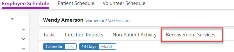 Axxess Hospice now provides a Bereavement Services tab on the Employee Schedule screen. When viewing the Bereavement Services tab, users will see all bereavement services assigned to them.
