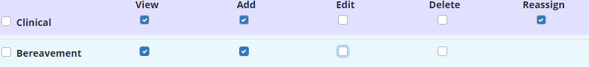 People tab ➜ People Center ➜ Edit ➜ Permissions tab ➜ Clinical section ➜ Bereavement ➜ View/Add ➜ Save