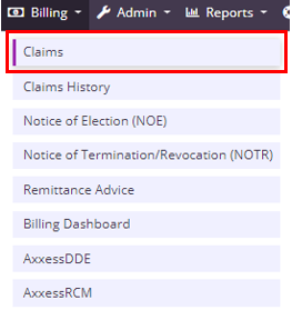 To view and process claims, navigate to the Billing tab and select Claims from the drop-down menu.