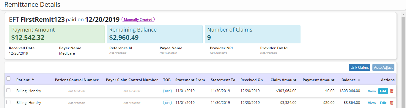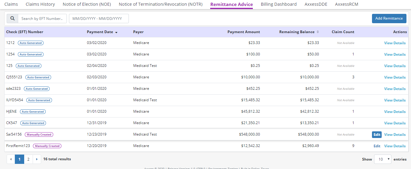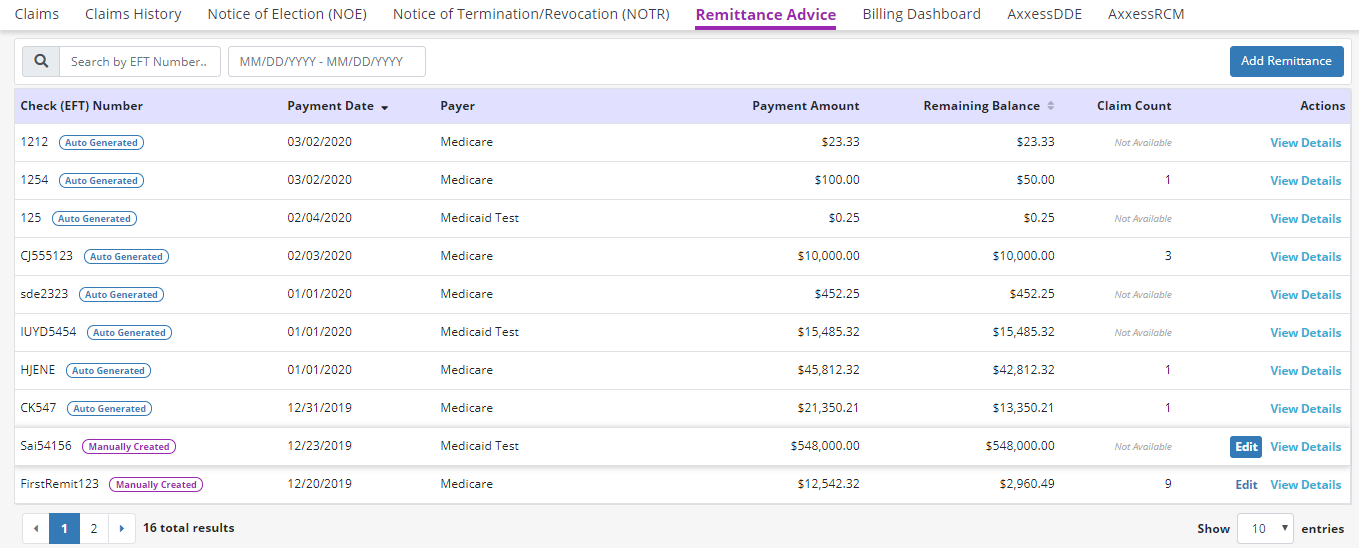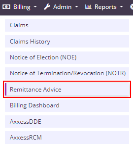 Manually created remittances can now be edited from the Remittance Advice screen. To view and edit remittances that were manually created, navigate to the Billing tab and select Remittance Advice from the drop-down menu.