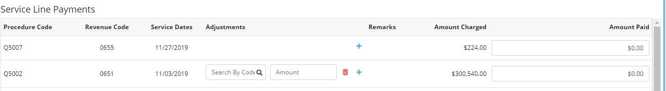 Under Service Line Payments, click the plus sign icon to add an adjustment or the trash can icon to delete an adjustment. To update the adjustment codes or amount, edit the fields under Adjustments or Amount Paid and click Save.