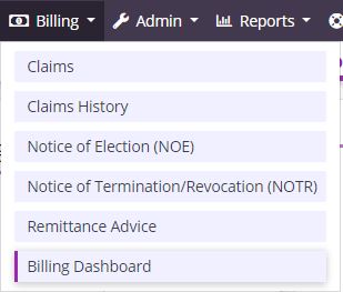 To access the Billing Dashboard, navigate to the Billing tab and select Billing Dashboard from the drop-down menu.