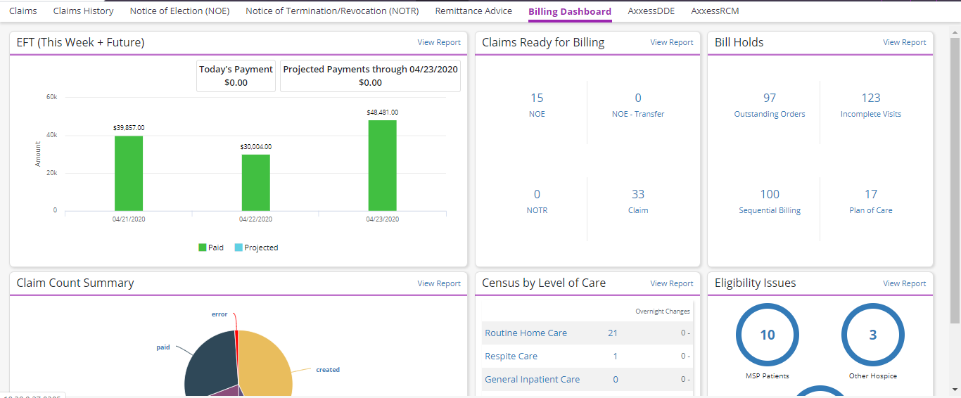 The new Billing Dashboard in Axxess Hospice enables users to track critical billing data in real time, so agencies can identify and address any issues that could compromise billing processes. This feature helps agencies optimize cash flow, protect revenue, and operate effectively based on data-driven billing insights.