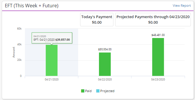 The EFT (This Week + Future) tile provides real-time, graphical data on current and projected payments (based on submitted claims). In the bar graph, green represents received payments and blue represents projected payments.