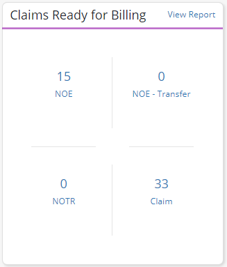 The Claims Ready for Billing tile provides the number of claims that are ready to be billed for each claim type. Claim types include NOE (81A), NOE-Transfer (81C), NOTR and Claims.