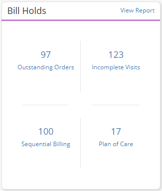 Select a number on this tile to view a detailed list of these items. Select View Report in the top right corner to view the full Bill Holds Report.