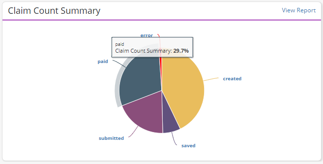 The Claim Count Summary tile provides a breakdown of all claims sorted by status. Claim statuses include created, saved, submitted, paid and error.
