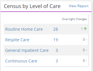 The Census by Level of Care tile provides a breakdown of active patients sorted by level of care. On the right side of the tile, overnight changes are highlighted in green to reflect any changes made after 5 PM (local time) on the previous day.