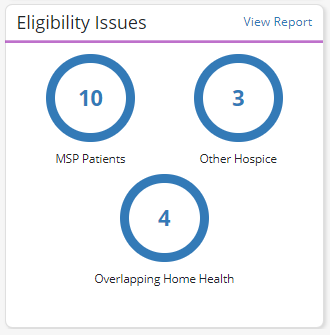 Select an eligibility issue on this tile to view a detailed list of active patients with the issue. Select View Report in the top right corner to view the full Eligibility Issues Report.