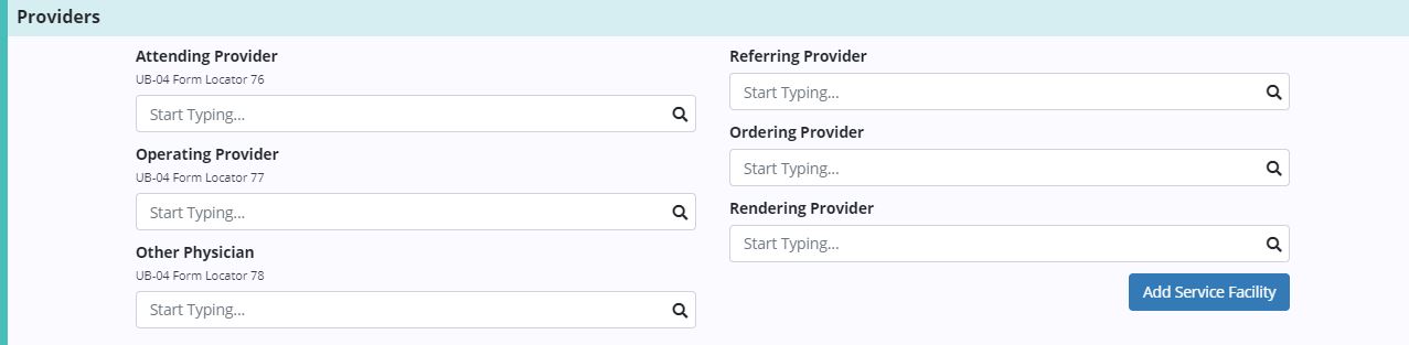 From the Claims screen, users can view, add and update facility NPIs by selecting Verify under Actions next to the desired claim. Scroll to the Providers section and click Add Service Facility.