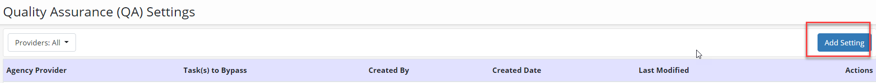 On the Quality Assurance Settings screen, select Add Setting.