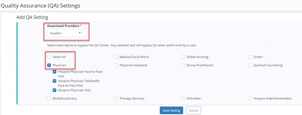 Under Bypass QA Center, select specific disciplines to bypass the QA Center or click Select All if all disciplines for the user should bypass the QA Center. Once a discipline is selected, all related tasks will automatically be selected. If any of the selected tasks should not bypass the QA Center, click the respective boxes to deselect the tasks. Once the desired selections have been made, click Save Setting.