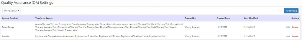 Once Save Setting is selected, the selected tasks will appear on the Quality Assurance Settings screen.
