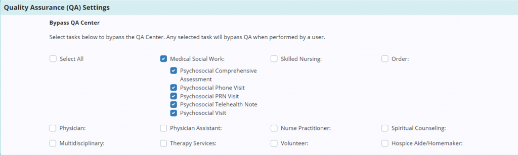 Axxess Hospice now enables users to bypass the Quality Assurance (QA) Center for one or more tasks performed by specific or all users. This functionality streamlines operations and facilitates compliance by enabling users to determine which tasks should flow to the QA Center for approval.
