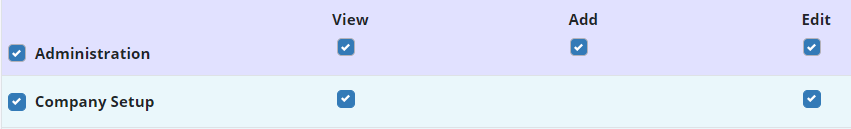 To give a user access to view and edit Company Setup, edit the user’s profile and navigate to the Permissions tab. In the Administration section, select View and Edit next to the Company Setup permission. Click Save to finish granting the permissions to the user.