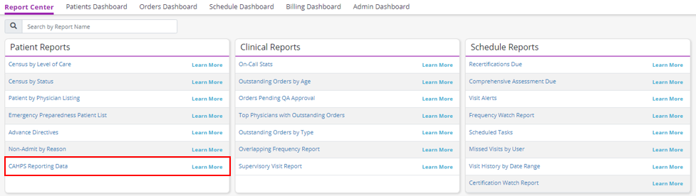 To generate the report, navigate to the Report Center under the Reports tab. In the Patient Reports section, select CAHPS Reporting Data, or click on Learn More to see a description, parameters and what data is included in the report.