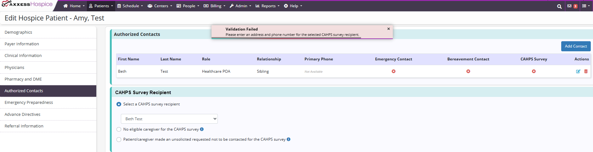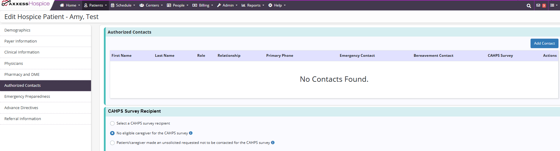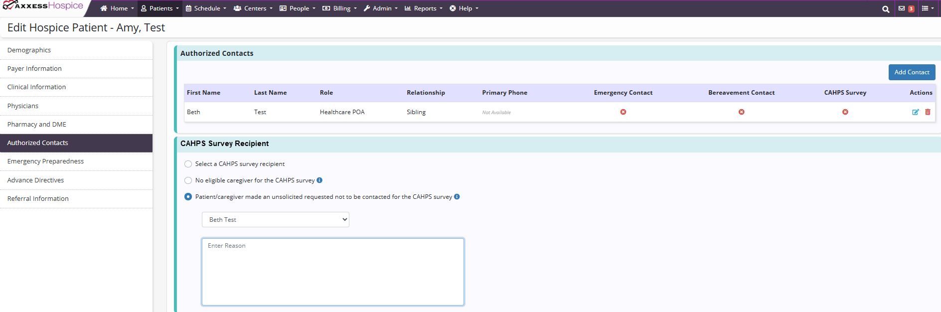 Axxess Hospice has added a CAHPS Survey Recipient section to the Authorized Contacts tab in the patient’s chart. This enhancement ensures compliance and streamlines operations by simplifying the process of managing CAHPS survey recipients, reducing errors and improving efficiency.