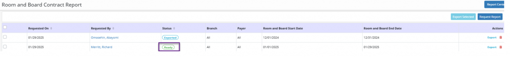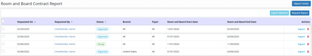 When selected, a table is displayed, detailing any previously requested reports. The table indicates when the report was requested, which user requested it, the status of the report, the branch, the payer and the room and board start and end date. Under the Actions column, users can elect to export the report or delete it.