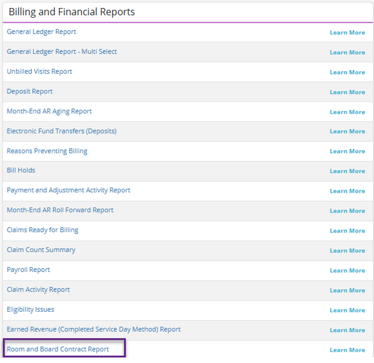 To access the Room and Board Contract Report, navigate to the Report Center under the Reports tab. In the Billing and Financial Reports section, select Room and Board Contract Report.