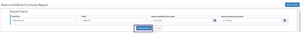 When selected, users can filter the report by Branches, Payer, Room and Board Start Date and Room and Board End Date. Once the desired filtering criteria is entered, select Request Report.