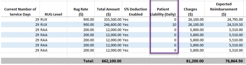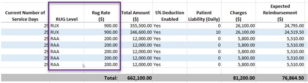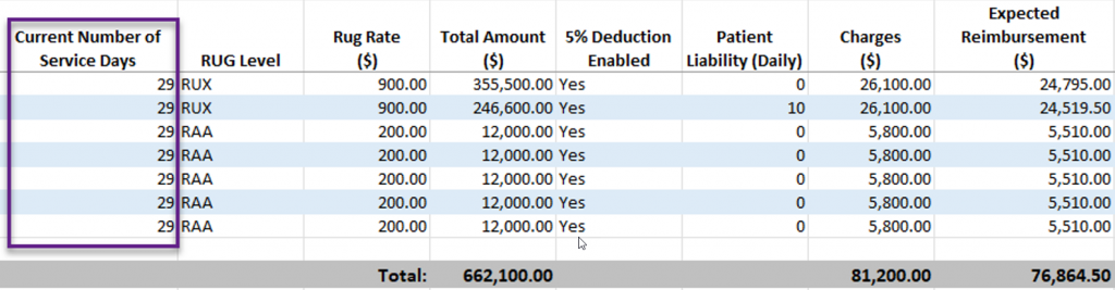 When exported, the user will see a new Current Number of Service Days column displayed. This column displays the total number of days the patient stayed at the facility at a specific RUG rate and includes the patient’s daily liability with a 5% deduction applied. This calculation impacts the Expected Reimbursement column.