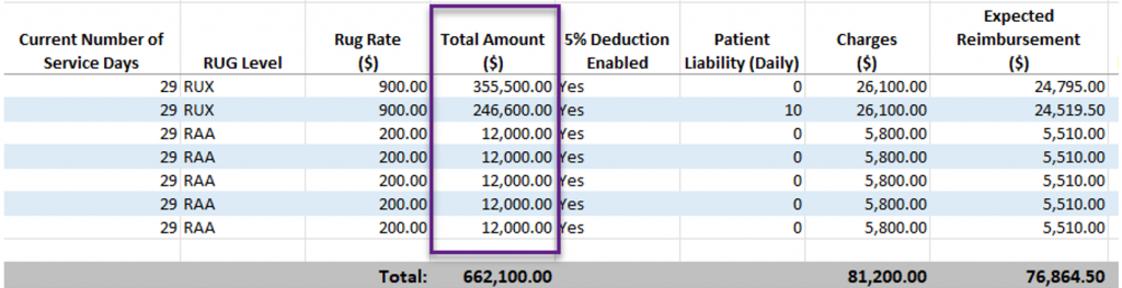 The Total Amount column multiplies the total number of days the patient has been in the facility regardless of the report date and and displays the cumulative amount accrued for the entire duration of the patient’s stay.