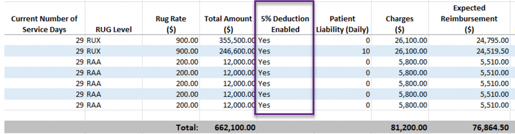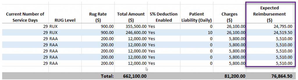 The Expected Reimbursement column subtracts the patient’s daily liability and the 5% payer deduction from the total charges, showing the amount the organization can expect to receive.