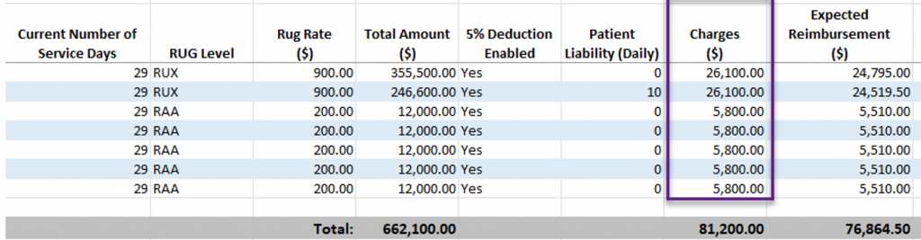 The Charges column displays the current number of service days multiplied by the RUG rate. This reflects the amount expected to be billed to the room and board payer.