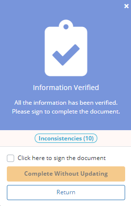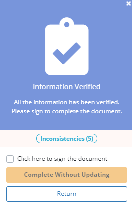 If any inconsistencies or warnings are flagged in the documents you selected, a blue badge on the Information Verified window will display the total number of inconsistencies in the selected documents. Select Complete Without Updating to approve the documents, or select Return to make corrections in any of the documents before approving.