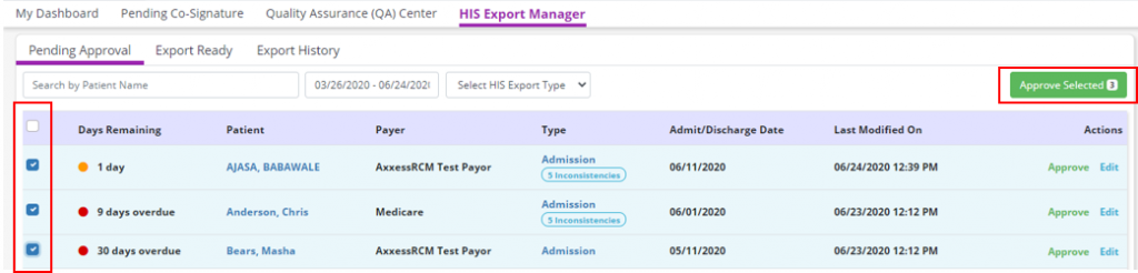 To approve multiple HIS files at once, check the boxes next to each file and select Approve Selected in the top right corner of the Pending Approval screen.