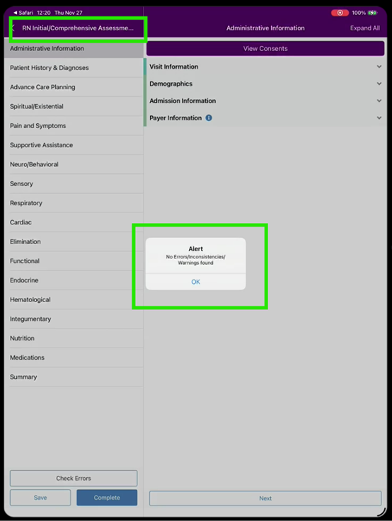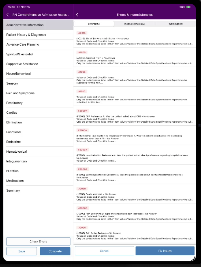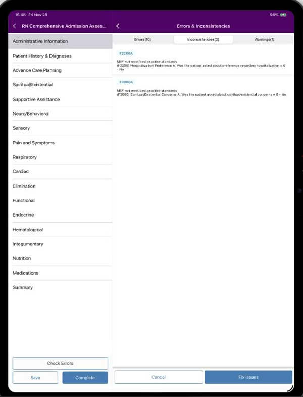 Axxess Hospice now enables users to check for errors when completing the RN Initial – HOPE, RN Initial/Comprehensive – HOPE, RN Comprehensive Admission – HOPE or RN Comprehensive (HUV) – HOPE assessment on the Axxess Hospice mobile application. By enabling users to conveniently check for fatal errors or clinical inconsistencies on HOPE assessments, this enhancement streamlines operations and facilitates compliance.