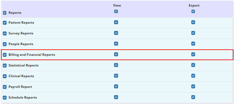 To give a user permission to view Billing and Financial Reports, navigate to the Permissions tab in the user’s profile. In the Reports section of permissions, select View next to the Billing and Financial Reports permission. To enable the user to export the report, select Export next to Billing and Financial Reports. Click Save to complete the process.