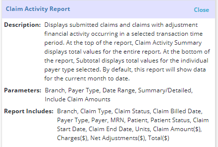 To view the Claim Activity Report, navigate to the Report Center under the Reports tab. In the Billing and Financial Reports section, click Learn More to see a description of the report, the report parameters and the information included in the report.
