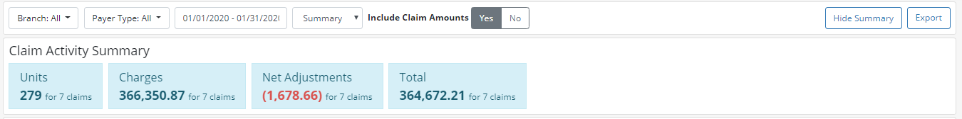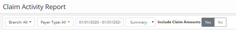 Select the Claim Activity Report to open it in a new browser tab. Use the menus at the top of the screen to filter by Branch, Payer Type and/or Date Range. In the fourth filter menu, select Summary or Detailed to generate a summarized or detailed view of the claim activity. Select Yes or No next to Include Claim Amounts. The default selection is Yes to include claim amounts in the report.