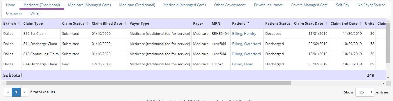 Details for each payer selected in the Payer Type filter can be reviewed by selecting the corresponding payer tab. Details of the report are specific to the selected payer, and the subtotal at the bottom of the report shows totals for the payer type selected.