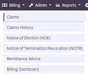 To view and process claims, navigate to the Billing tab and select Claims from the drop-down menu.